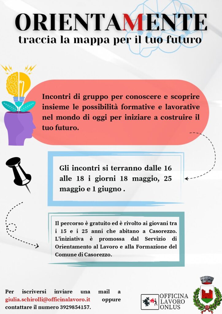CASOREZZO Destinatari ne sono i ragazzi tra i 15 e i 25 anni. Quelli che sono impegnati a decidere che cosa fare del loro futuro professionale. Il comune di Casorezzo propone loro l’iniziativa “Orientamente” e lo fa in tre date differenti ovvero mercoledì 18 maggio, giovedì 25 e il primo giugno.