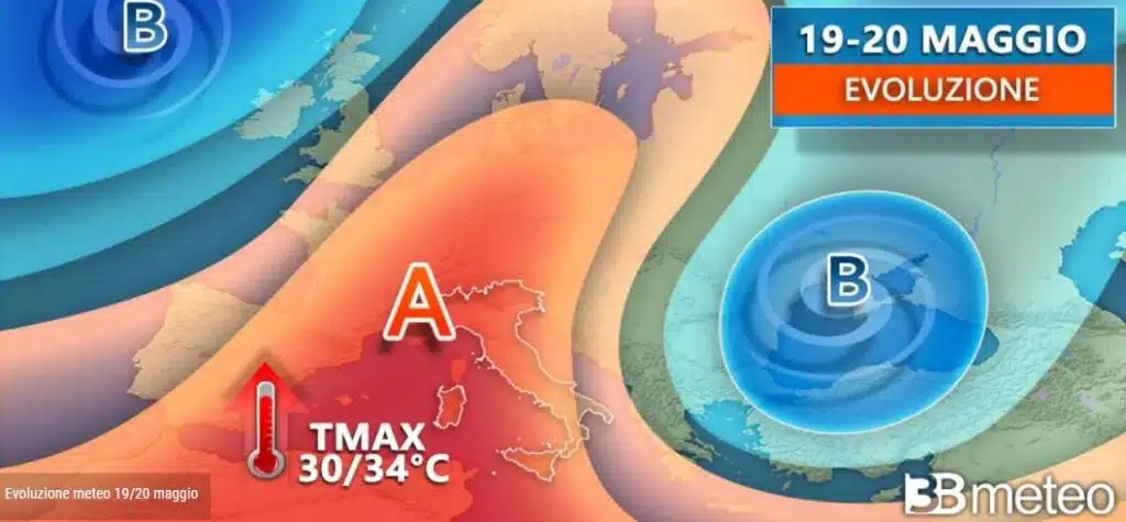 ARRIVA L’ANTICICLONE AFRICANO, PRIMA SERIA ONDATA DI CALORE ENTRO IL WEEKEND – ”Nei prossimi giorni l’anticiclone africano interesserà in modo via via più deciso l’Italia” – prosegue Ferrara di 3bmeteo.com – “unica defaillance mercoledì quando correnti temporaneamente più fresche da Est favoriranno qualche acquazzone o temporale specie a ridosso dei rilievi e un parziale calo termico specie su versante Adriatico e Pianura Padana centro-orientale. Tuttavia già da giovedì assisteremo a stabilità quasi assoluta con tanto sole fino al weekend, al più qualche temporale occasionale su Alpi, Prealpi e pedemontane. In questa fase assisteremo inoltre alla prima seria ondata di caldo africano, con punte di oltre 30°C fino a picchi di 33-35°C in Pianura Padana tra sabato e domenica. Più fresco lungo le coste, mitigate dalle brezze marine”.