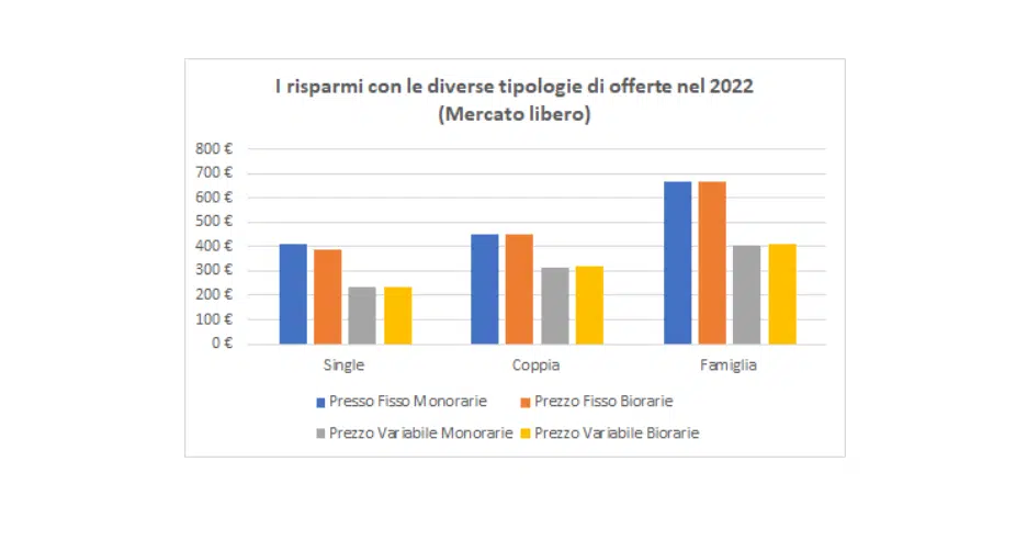 Il risparmio a disposizione di chi passa dalla Maggior Tutela al Mercato Libero รจ strettamente legato al tipo di offerta attivata. Lโindagine, infatti, approfondisce la questione verificando quali sono le tipologie di tariffa piรน vantaggiose da attivare per i tre profili di consumo analizzati. Considerando le proposte dei fornitori di luce e gas a maggio 2022,ย le offerte a prezzo fisso si dimostrano quelle piรน convenienti, garantendo, in media, un risparmio maggiore rispetto alla Tutela.