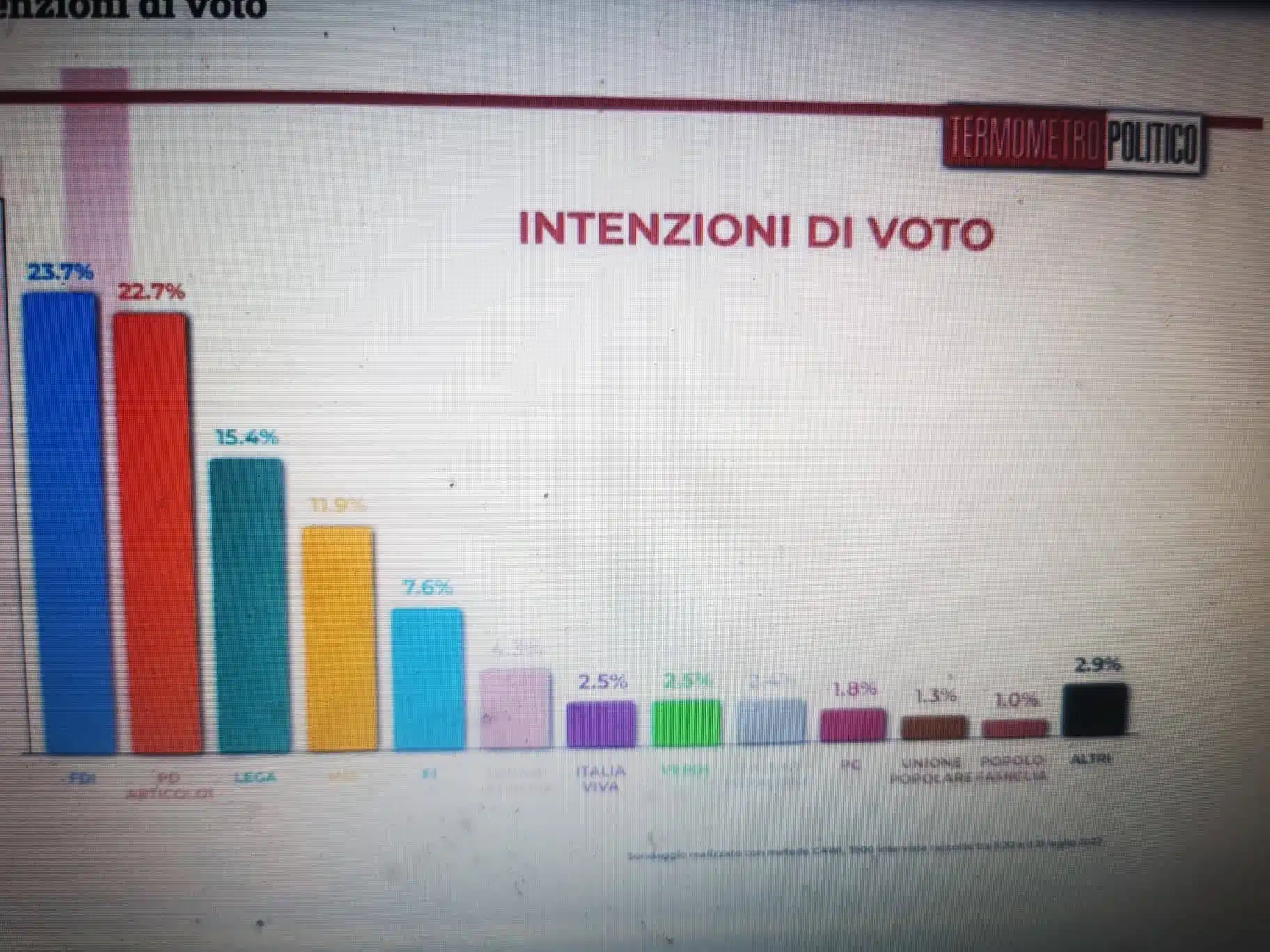 Ne circolano di ogni tipo e genere. Noi oggi vogliamo proporvi gli ultimi due diffusi nelle 24 ore appena trascorse, quindi i più recenti. Dapprima quello di TERMOMETRO POLITICO, che attesta posizioni pressoché identiche a tutti gli altri: Fdi e Pd su tutti, Lega solidamente terzo partito, 5 Stelle in caduta libera, Forza Italia che per alcuni è verso la doppia cifra e per altri meno. Per Termometro Politico, nel dettaglio, Fdi e Pd ingrossano i propri consensi salendo rispettivamente al 23,7% e al 22,7%. In calo le forze politiche che hanno causato la fine del governo Draghi: la Lega scende al 15,4%, il M5S all’11,9% e Forza Italia al 7,6%. Stabile al 4,3% Azione/+Europa, Italia Viva (2,5%) raggiunge i Verdi/Sinistra Italiana e supera Italexit (2,4%). Fanalini di coda sono l’alleanza guidata dal Partito Comunista (1,8%), Unione Popolare (1,3%) e Alternativa per l’Italia (1%). Così un sondaggio realizzato da Termometro Politico tra il 19 e il 21 luglio sulle intenzioni di voto degli italiani.