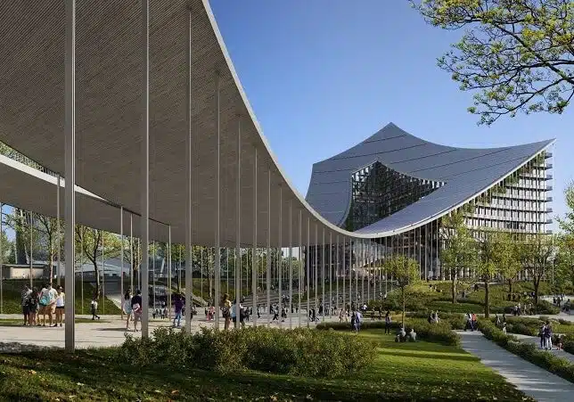 Cuore tecnico e simbolico del complesso, il primo in Italia a ottenere le più alte certificazioni di sostenibilità e connettività WiredScore Platinum, WELL Platinum e LEED Platinum, la Canopy: una struttura sospesa in legno (pannelli CLT – Cross Laminated Timber) pensata per collegare due edifici a geometria variabile, estendendosi con una linea fluida e ardita per una lunghezza di 140 metri. Una copertura che non ha precedenti nel panorama edilizio contemporaneo, pensata non solo come elemento architettonico, ma anche come impianto produttivo di energia rinnovabile. Con i suoi 11.000 mq di pannelli fotovoltaici integrati, produrrà oltre 1,4 MWh/anno, contribuendo a una riduzione dei consumi energetici del 30-40% rispetto a edifici analoghi e abbattendo ogni anno circa 400 tonnellate di anidride carbonica, pari alla CO2 assorbita da 15mila alberi.