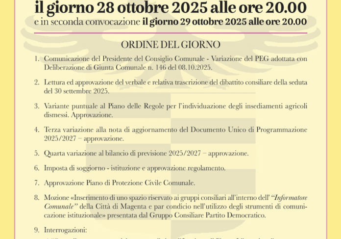 Tra i temi all’ordine del giorno figurano la variante puntuale al Piano delle Regole per l’individuazione degli insediamenti agricoli dismessi, la variazione al Documento Unico di Programmazione 2025/2027, la quarta variazione al bilancio di previsione e l’istituzione dell’imposta di soggiorno con relativo regolamento.