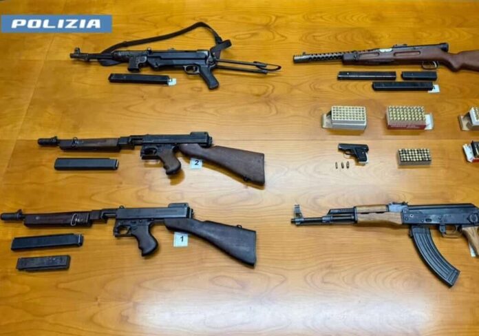 I poliziotti hanno seguito i due, riuscendo a intercettare il furgone, guidato dal 41enne, nei pressi di un centro commerciale a Garbagnate Milanese. All’interno del veicolo sono state rinvenute e sequestrate due pistole mitragliatrici Thompson calibro 45, entrambe classificate come armi da guerra, una pistola mitragliatrice MP40 calibro 9, classificata come arma da guerra, un fucile Beretta modello Moschetto calibro 38 automatico, due calcioli per impugnatura a spalla e 33 cartucce calibro 9