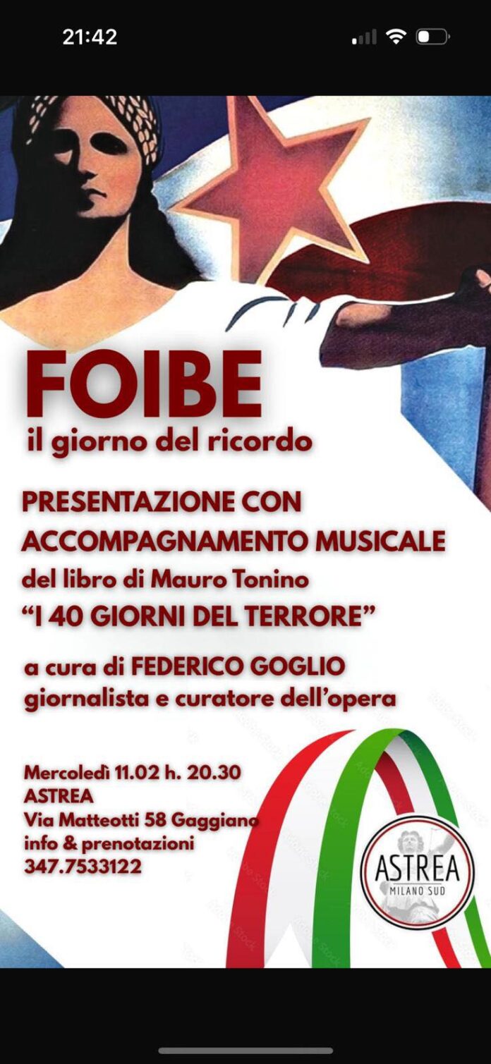 A Gaggiano, nei giorni dedicati al ricordo dei Martiri delle Foibe, la sede di Astrea Milano Sud promuove una serata di riflessione con la presentazione del libro I 40 giorni del terrore di Mauro Tonino. L’incontro vedrà la partecipazione di Federico Goglio, giornalista e curatore dell’opera, che accompagnerà il pubblico in un percorso di approfondimento storico arricchito anche da un momento musicale, pensato per rafforzare l’impatto emotivo e culturale delle tematiche affrontate. L’iniziativa si svolgerà mercoledì 11 febbraio alle 20.30 presso Astrea, in via Matteotti 58.