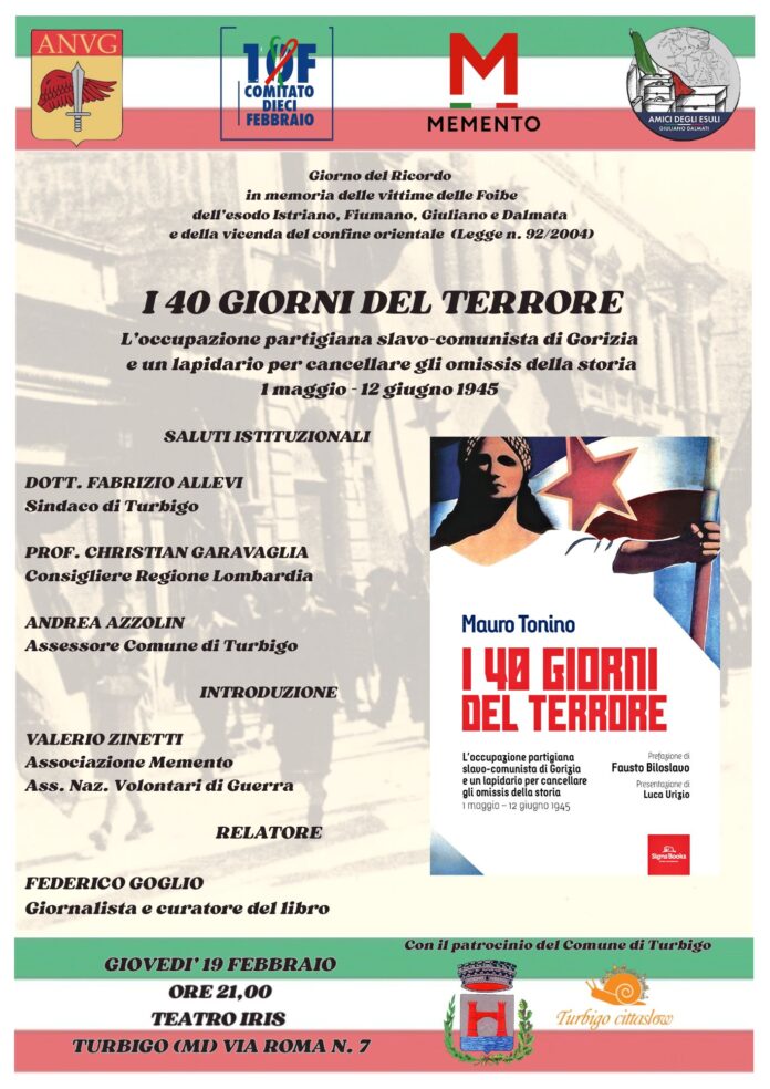 Un secondo appuntamento è in programma a Turbigo, dove giovedì 19 febbraio alle ore 21.00, presso il Teatro Iris, si terrà l’annuale iniziativa per il Giorno del Ricordo. Anche in questo caso al centro della serata ci sarà il volume I 40 giorni del terrore. L’occupazione partigiana slavo-comunista di Gorizia e una lapide per cancellare gli omissis della storia (1 maggio – 12 giugno 1945), che ricostruisce i drammatici eventi di Gorizia nel 1945.