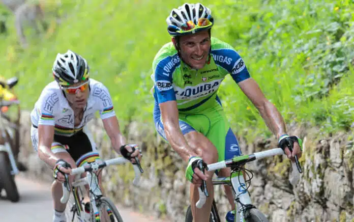 Con questi presupposti che a definire solo bellicosi si fa un torto all’agone del momento, si forma un terzetto al comando e, con Basso a fare da locomotiva, restano agganciati il compianto Michele Scarponi e un giovane Vincenzo Nibali, delfino di Ivan che si rivelerà determinante oltre che già fortissimo. La bellezza di Basso in salita è abbacinante e fa rima con eleganza. Mani al centro del manubrio, cadenza ossessivamente regolare da farlo sembrare un robot, schiena immobile da poterci posare una coppa di Champagne sopra con la certezza di non rovesciarla. Lo spettacolo del ciclismo. La fatica immane, poi, gli impone sempre un ghigno tutto particolare, marchio di fabbrica inconfondibile che finisce per scoraggiare le velleità del rivali: Ivan, infatti, pare sorridere.
