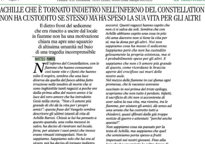 L’articolo di Forte ripercorre i momenti in cui le fiamme e il fumo hanno trasformato una serata di festa in un incubo. In quel caos, Achille era riuscito a mettersi in salvo, raggiungendo l’uscita. Tuttavia, anziché fuggire, il ragazzo ha scelto di compiere un “dietro front” inspiegabile per le sole leggi della sopravvivenza: è rientrato nel locale in fiamme per cercare di aiutare gli amici rimasti intrappolati.