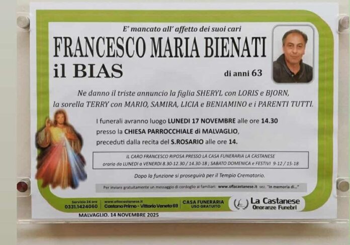 Si terranno lunedì 17 novembre i funerali di Francesco Maria Bienati, conosciuto da tutti come il Bias. L’uomo, molto noto non solo a Malvaglio ma in tutto il territorio del Castanese, si è spento venerdì all’età di 63 anni, lasciando un grande vuoto nella sua comunità. Le esequie avranno luogo alle 14.30 presso la chiesa parrocchiale di Malvaglio, precedute alle 14.00 dalla recita del Santo Rosario, momento di raccoglimento al quale parteciperanno amici, conoscenti e molti di coloro che negli anni hanno incrociato il suo cammino.