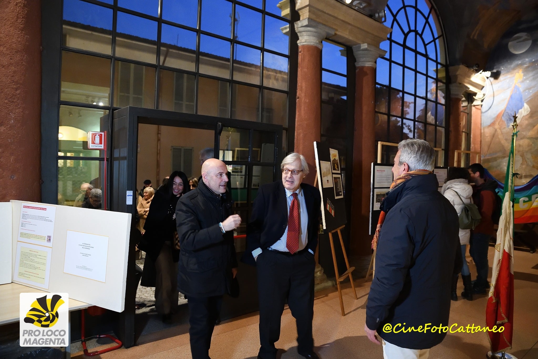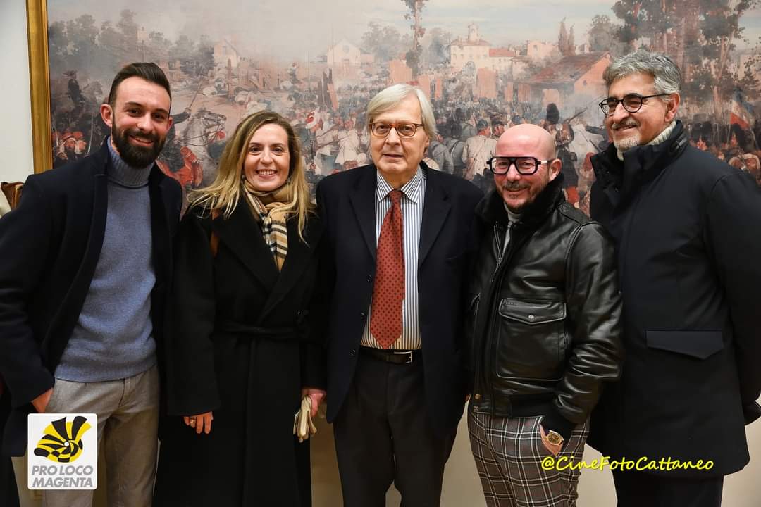 Affermazione che ha fatto molto piacere a chi, come me, l’abbia udita. Sempre che non si sia trattato di un mero commiato di cortesia. Dubitare è lecito, siamo in democrazia e per di più in campagna elettorale. Tuttavia, a giudicare dall’interesse e dall’attenzione prestate alle parole di Pietro Pierrettori, che gli ha fatto da guida nelle stanze della storica dimora, il Professore è parso sincero. Proseguendo a ritroso nella cronaca, è doveroso riportare il <<bravissimo>>, rivolto da Sgarbi al ‘nostro’ cicerone al termine delle intense spiegazioni di questi sugli affreschi di Giacomo Campi, sulle ferite della facciata, sui cimeli custoditi nelle teche, sul falso storico contenuto nel dipinto di Giovanni Fattori di cui, al primo piano, troneggia la riproduzione. Insomma, per farla breve, il critico d’Arte ha mostrato di gradire quanto Magenta offre a testimonianza e ricordo di una pagina importante della Storia d’Italia, compresi i filmati e le fotografie celebrativi degli anniversari del Centenario e del Centocinquantesimo della Battaglia del 1859. Ma Magenta non è solo ‘Battaglia’, alla cui Rievocazione, per altro, Sgarbi ha chiesto di essere invitato. No, Magenta dà il nome al colore dell’anno. Magenta è stata la Saffa, per citare un simbolo del suo passato industriale. Magenta ha la Chiesa di Santa Maria Assunta, di indubbio interesse artistico, ora in corso di restauro. Magenta ha un Teatro …