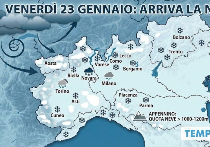 Venerdì 23 gennaio entrerà ufficialmente in scena il primo sistema perturbato, giornata in cui le nevicate potrebbero manifestarsi a tratti fino in pianura tra Piemonte, Valle d’Aosta, l’entroterra della Liguria e la zona occidentale dell’Emilia. Oltre a queste aree, la neve potrà cadere fino al fondovalle sulle restanti vallate delle Alpi.