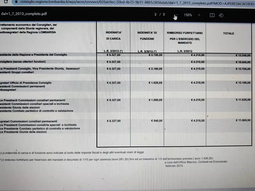 Come riportato nella tabella che alleghiamo, gli emolumenti di Presidente e Consiglieri della Lombardia vanno da 11mila a 13mila euro LORDI al mese, comprensivi di indennità di carica e di funzione. Di seguito il dettaglio delle singole cariche politiche elettive.
