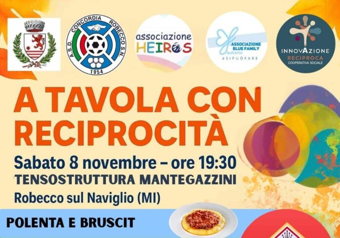 Non una semplice cena, ma un momento di comunità, solidarietà e condivisione. Sabato 8 novembre alle ore 19.30, presso la tensostruttura Mantegazzini di Robecco sul Naviglio, si terrà “A Tavola con Reciprocità”, l’evento benefico promosso da ASD Concordia Robecco, Associazione Heiros, Associazione Blue Family Autismo e Cooperativa Innovazione Reciproca, con il patrocinio del Comune di Robecco.