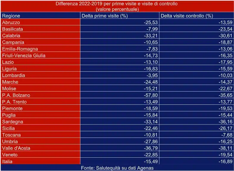Analizzando i dati in termini percentuali per rendere meglio l’idea della differenza tra 2022 e 2019, meglio rispetto alla media nazionale Campania (-1,19%), Lazio (-4,77%), Lombardia (-4,79%), Basilicata (-5,98%). Mancano invece all’appello oltre una prestazione su 5 in Calabria (-20,51%), Sardegna (-21,27%), Valle d’Aosta (-32,55%), P.A. Bolzano (-45,34%).