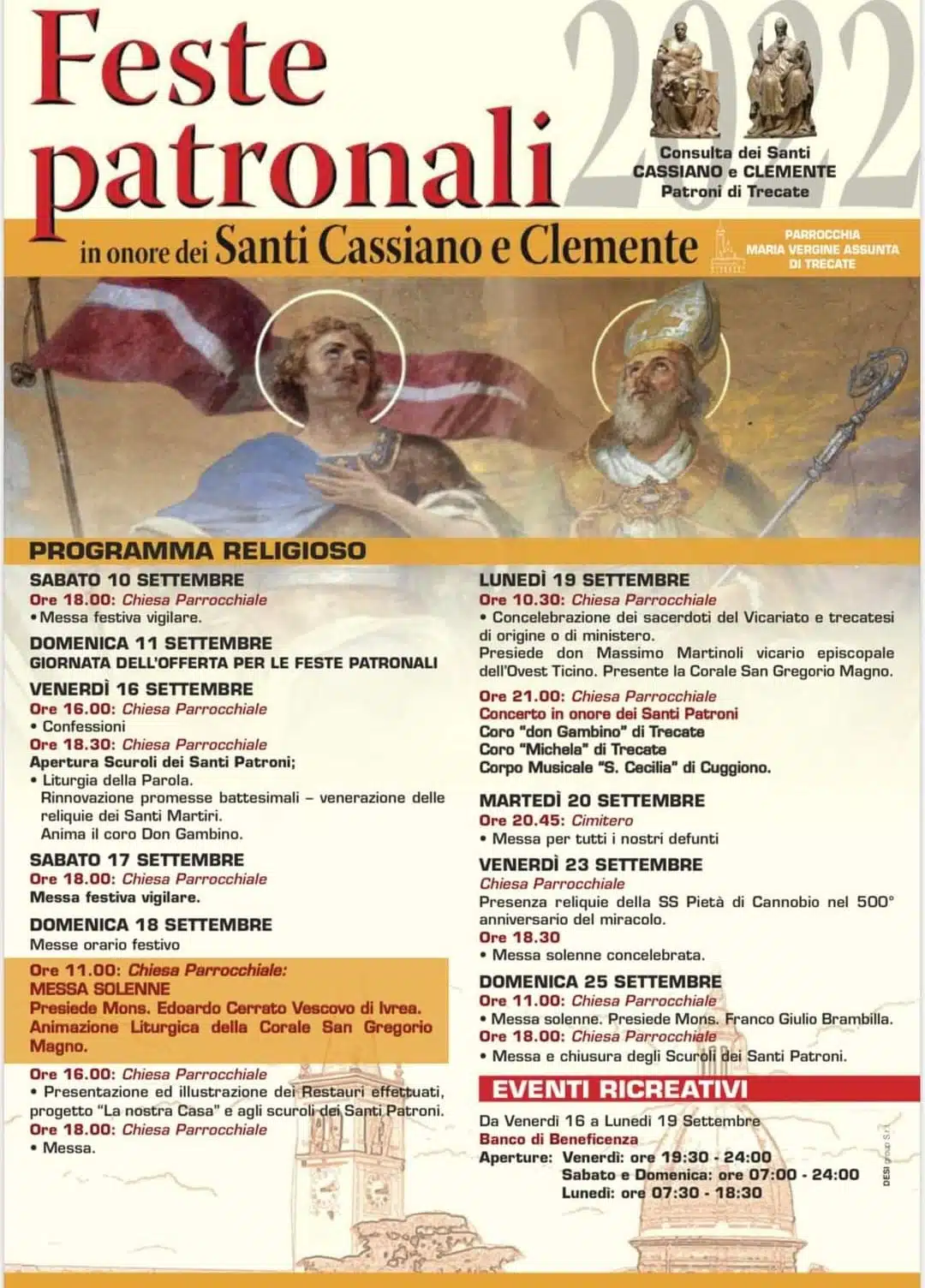 TRECATE NO – Iniziative all’insegna del coinvolgimento della città e delle diverse fasce d’età: l’Amministrazione ufficializza il calendario di appuntamenti che il Comune dedica alla festa dei patroni della città, i santi Cassiano e Clemente. Un cartellone nel quale sono presenti novità, ma anche momenti di intrattenimento legati alla tradizione trecatese e che è stato curato, in particolare, dai Settori Cultura, Urp e Lavoro, Eventi e Attività produttive del Comune con il coinvolgimento e la collaborazione della Pro Loco, della Biblioteca civica, dell’Associazione trecatese di storia e cultura locale, del gruppo Alpini “A. Geddo”, del mondo agricolo trecatese.